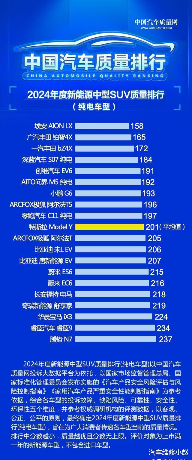 这两年啊,有一种车在国内可受欢迎啦,那就是纯电动中型SUV。为啥受欢迎呢?一来它符合节能减排的新潮流,二来还能让养车成本降下来,所以就渐渐成了消费者眼中的“新宠”呢。像特斯拉Model Y、零跑C11、问界M5、丰田bZ4X、小鹏G6、比亚迪宋L、比亚迪唐EV、蔚来ES6还有福特电马等等这些车型,热度都挺不错的哦。就在今天呢,中国汽车质量网按照各车型的投诉故障情况,还有缺陷风险、可靠性以及安全性等方面来综合考量,公布了2024年纯电动中型SUV的质量排行呢。结果出来啦,丰田bZ4X、深蓝S07、问界M5和小鹏G6都进到了前十的榜单里哦。特斯拉Model Y呢,也算是勉强达到了标准吧。还有阿尔法T、宋L EV、唐EV、蔚来ES6以及福特电马这些车,质量表现也还说得过去呢。这不,官宣啦!2024纯电动中型SUV质量排行出来咯,Model Y排在第10名,问界M5、宋L也都上了榜呢!
